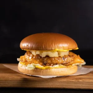 булка, котлета из курицы., сыр, ананас кон., салат зел., соус: сырный