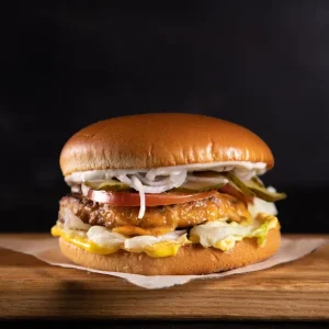 булка, котлета из курицы, сыр, помидоры св., огурец кон., лук маринованный, салат зел.,