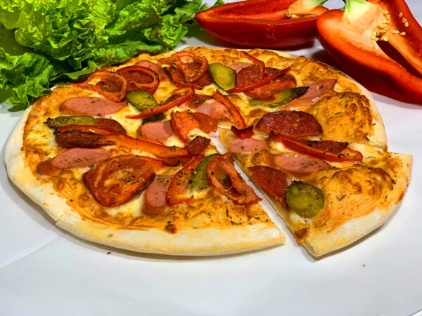 соус чесн., сырный, ветчина, салями кв, шампиньоны, Моцарелла