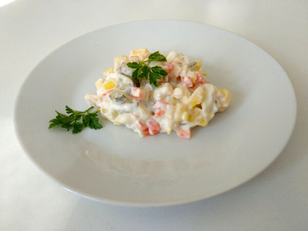 курица, картофель, горошек, яйцо, огурец сол., майонез