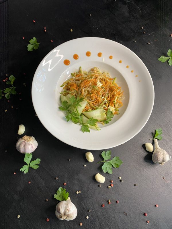 морковь св., перец сл. св., лапша фунчоза, креветки, чеснок, соевый соус, кунжут